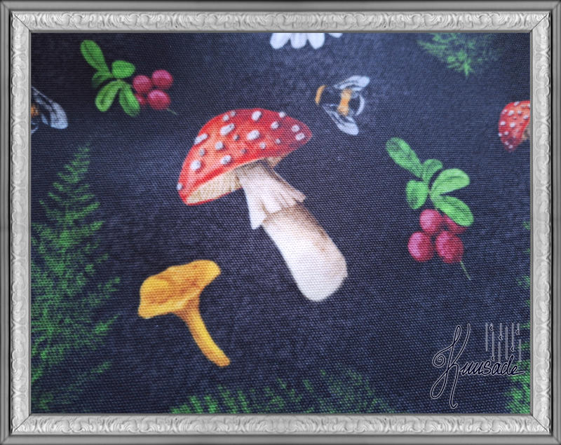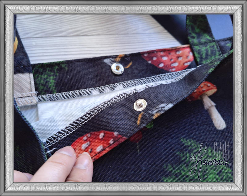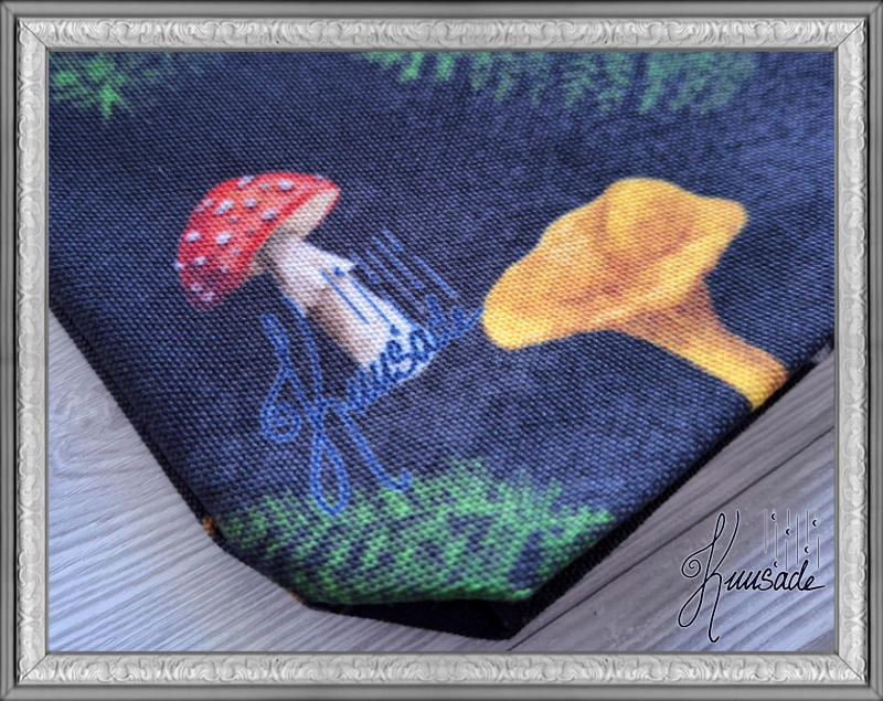The Canvas totebags of Kuusade are printed from the own art of Jenna Tuomala. The material on the totebags is thicker and more durable Canvas-style polyester fabric. The bags have a snap for fastening and a small, separate zipper pocket inside