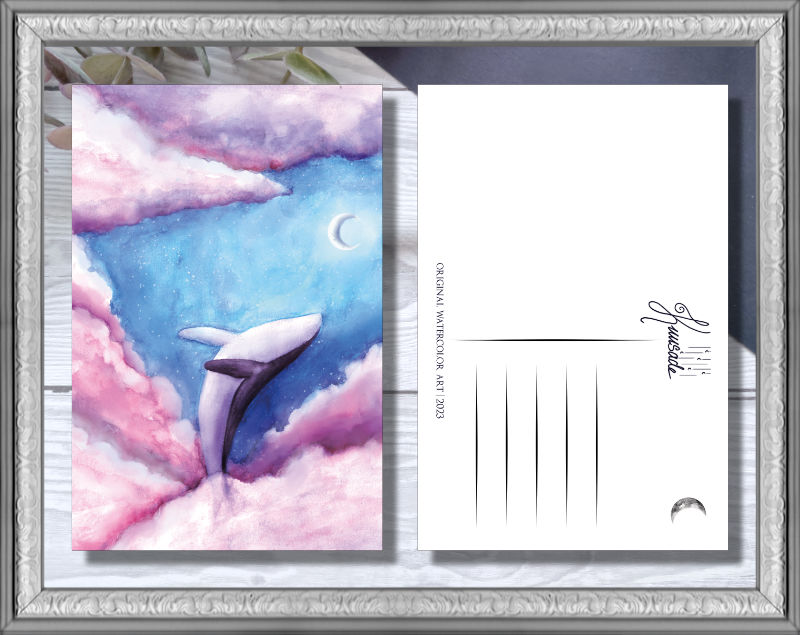 The postcards of Kuusade are made from the art of Jenna Tuomala and printed at professional printer to 350gsm matt paper with matt lamination on front. Behind the postcard is space for a message, address and stamp with the logo of Kuusade and the year and the technique the art was made in english