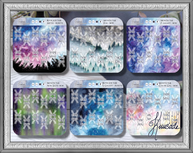 Tabeja tulee yhdellä arkilla 12 (yksi jokaista kuukautta) ja voit valita niiden taustan viidestä eri vaihtoehdosta. Tabit on saatavilla jokaisen kuukauden kolmella ensimmäisellä kirjaimella suomeksi tai englanniksi.